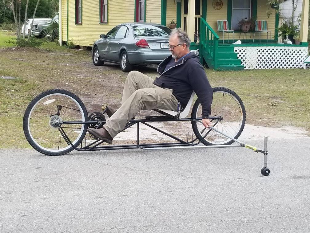 There is an issue with the pedal / bottom bracket and seat position. Most recumbent bikes have the bottom bracket higher than the seat. Although I have seen a few designs where the seat and bb are on the same plane, who knows if it works well. I have found that the seat should have a 115 degree offset compared to the seat bottom. I will mock up something to try with some boards and wire ties.