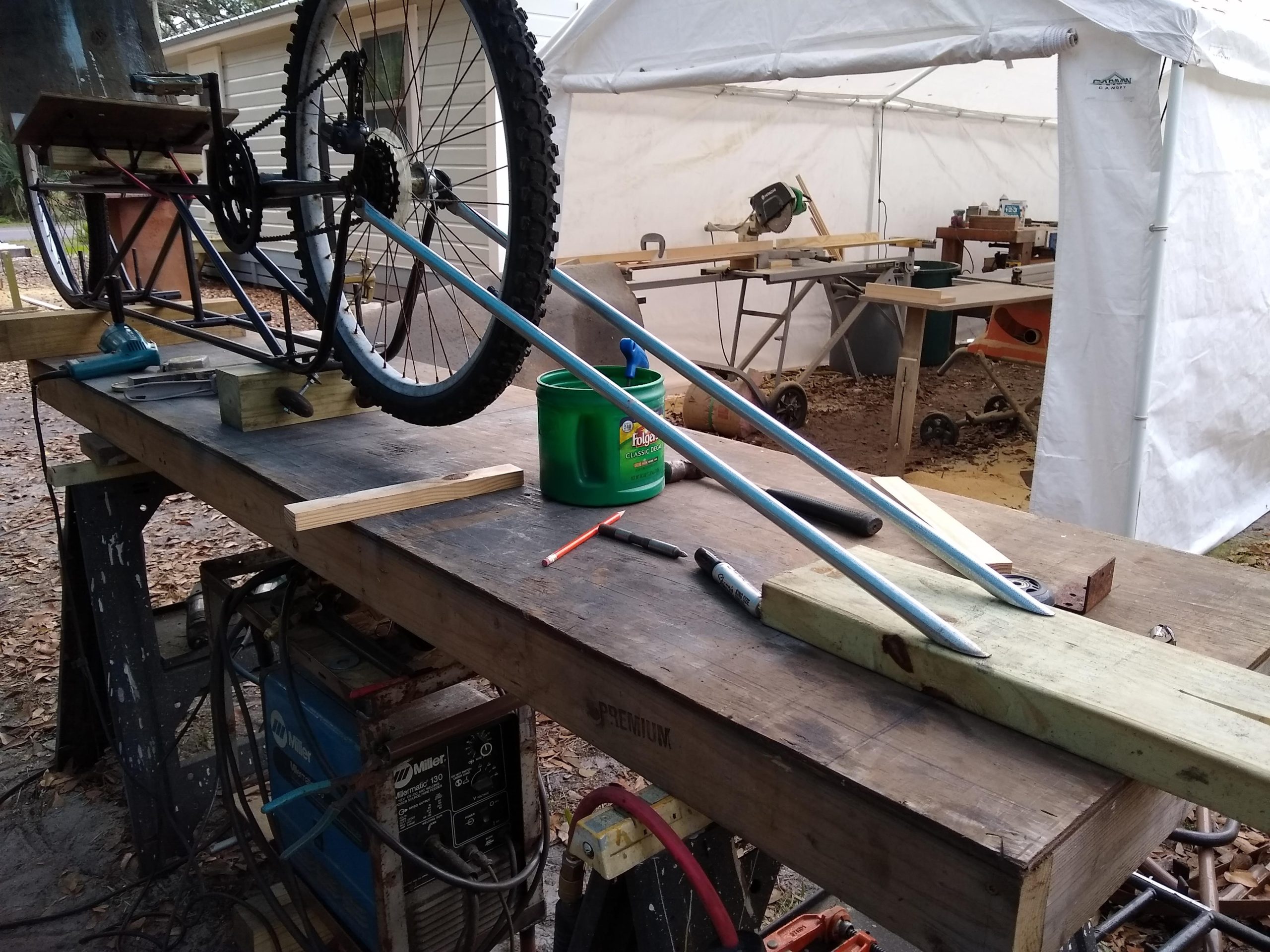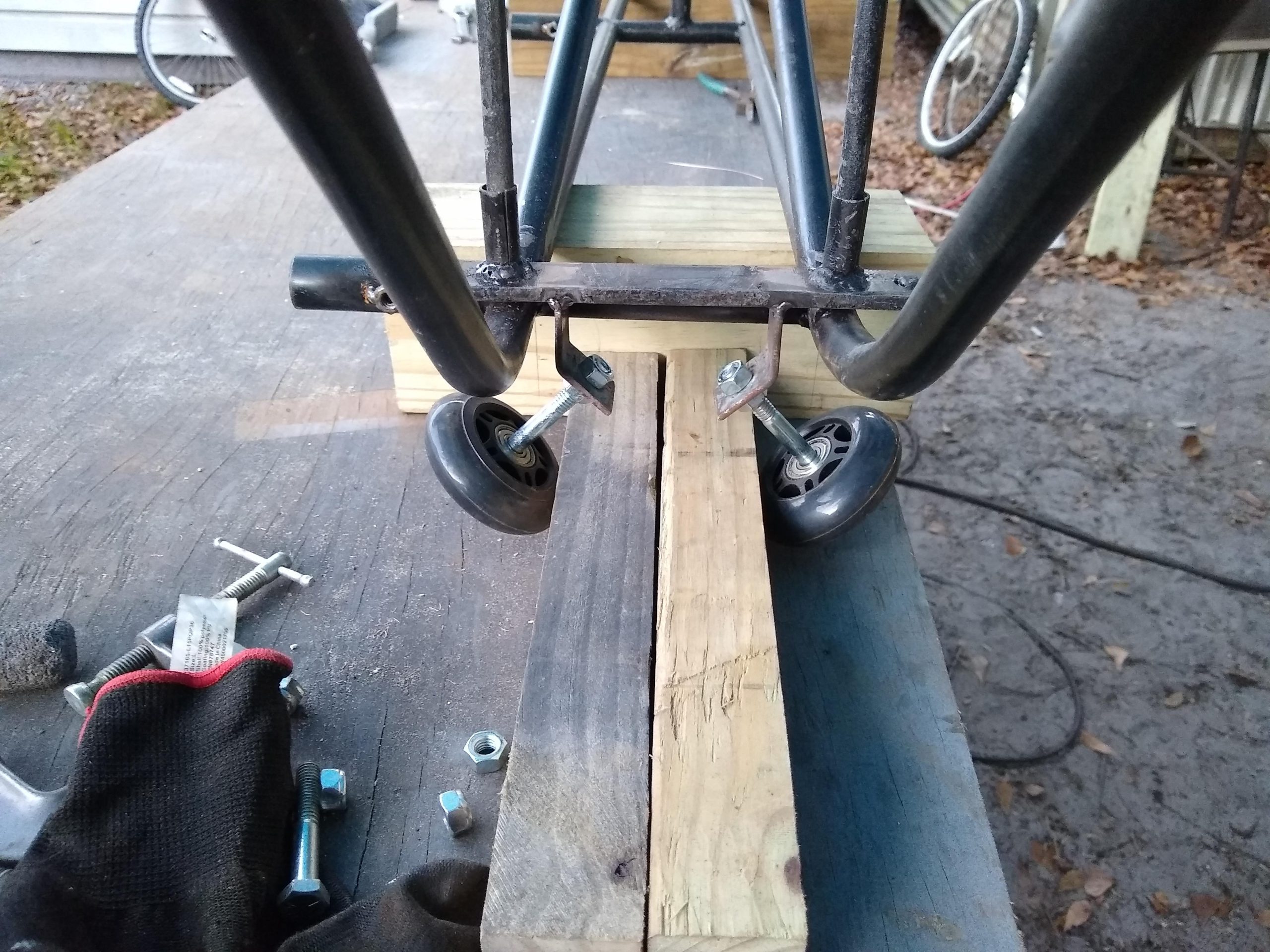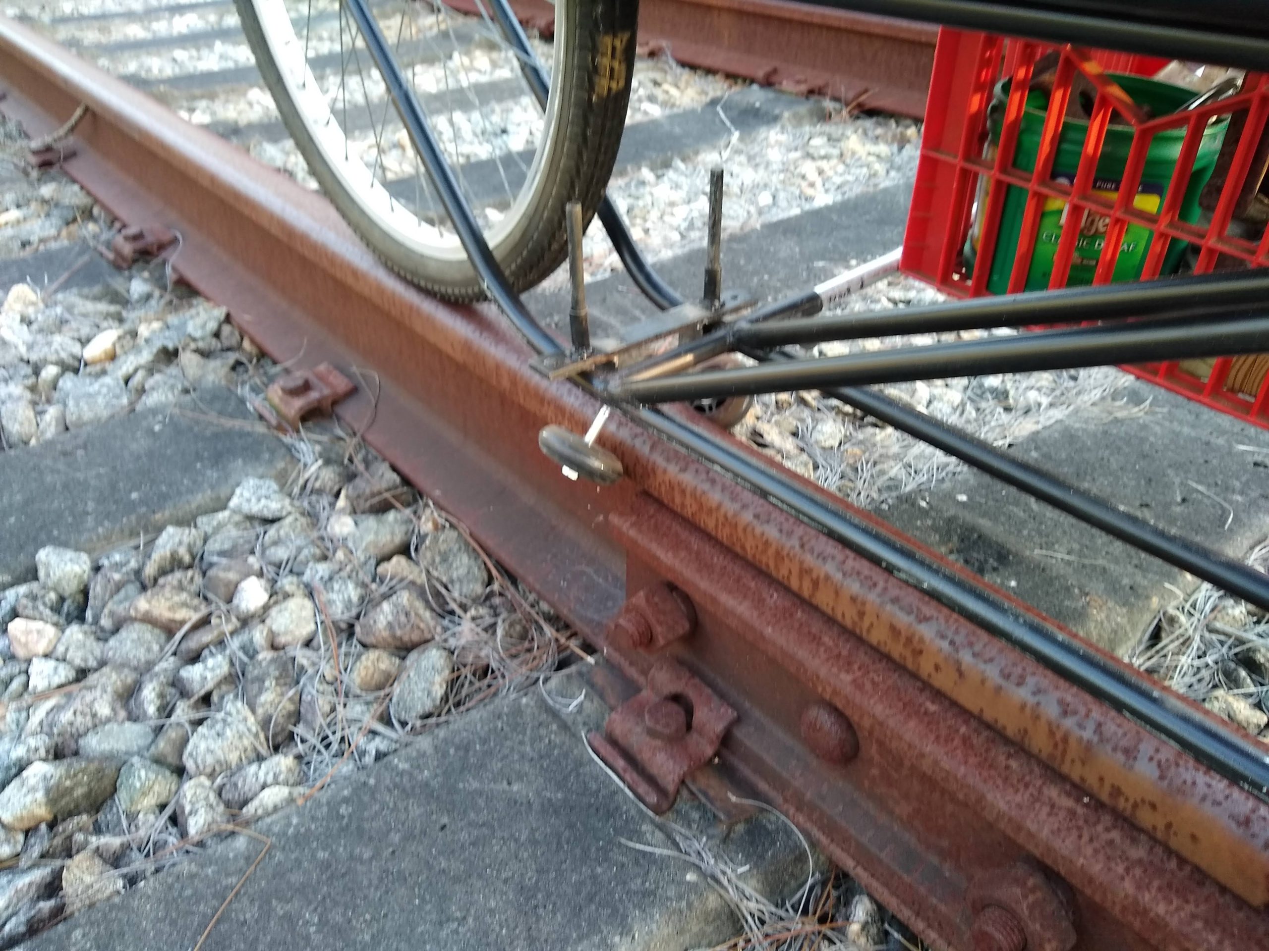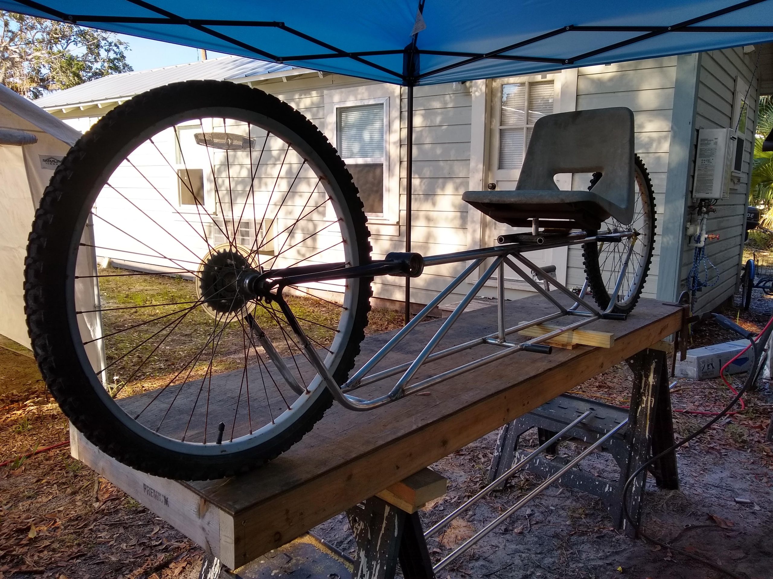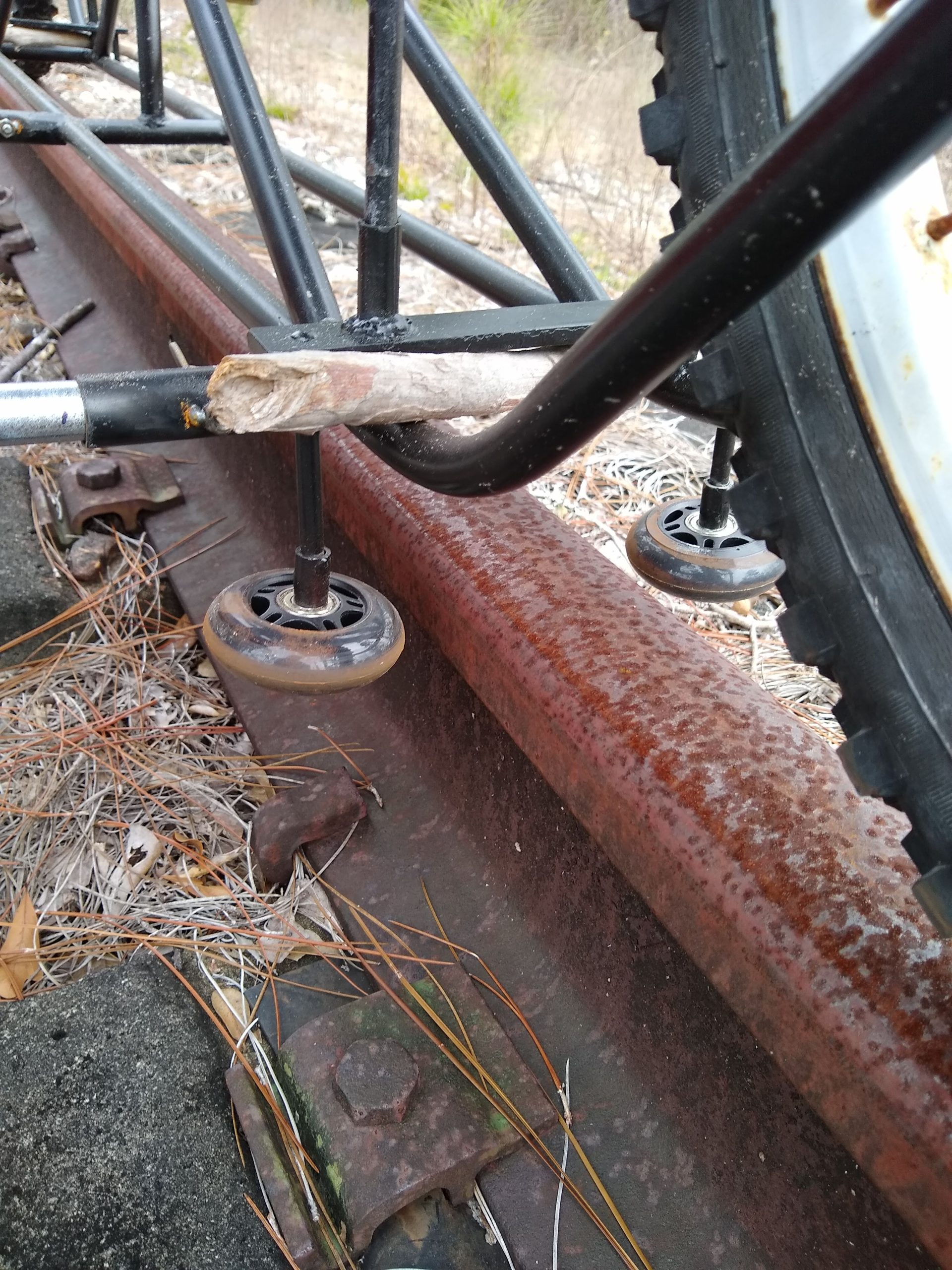 I’ve been looking at images and videos of rail bikes trying to come up with a design that would fit my needs. One of the concerns that I uncovered through listening to what people had to say on forums was that the traditional rail bike that rides on top of the rails with a standard bicycle with an outrigger and a front rail guide sits pretty high up in the air. Having reached an age where being brittle is a factor, I decided to design a more low to the ground recumbent style bike. Living in an area where sourcing materials can be somewhat challenging I had to make do with what was on hand locally. I decided to make the majority of the frame out of half inch EMT tubing which I can get at the hardware store. The local bike shop donated some parts which I cut up and made into the front and rear wheel supports. The seat which is adjustable was found on a abandoned lot.
